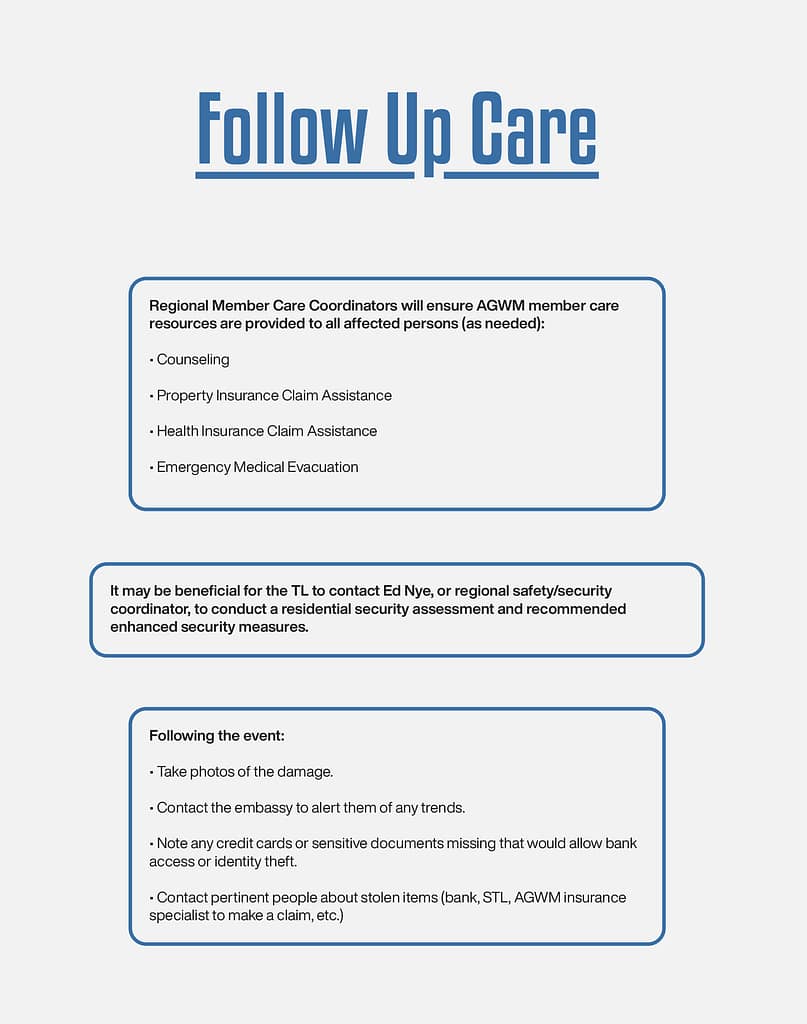 We function in a support role to the regions and ministries of AGWM. Normally, we do not have decision making authority. We exist to equip you, your team, field, area, region, and ministry. We want you to reach out to us if you need anything security related and we will do our best to help you and answer any questions you might have.